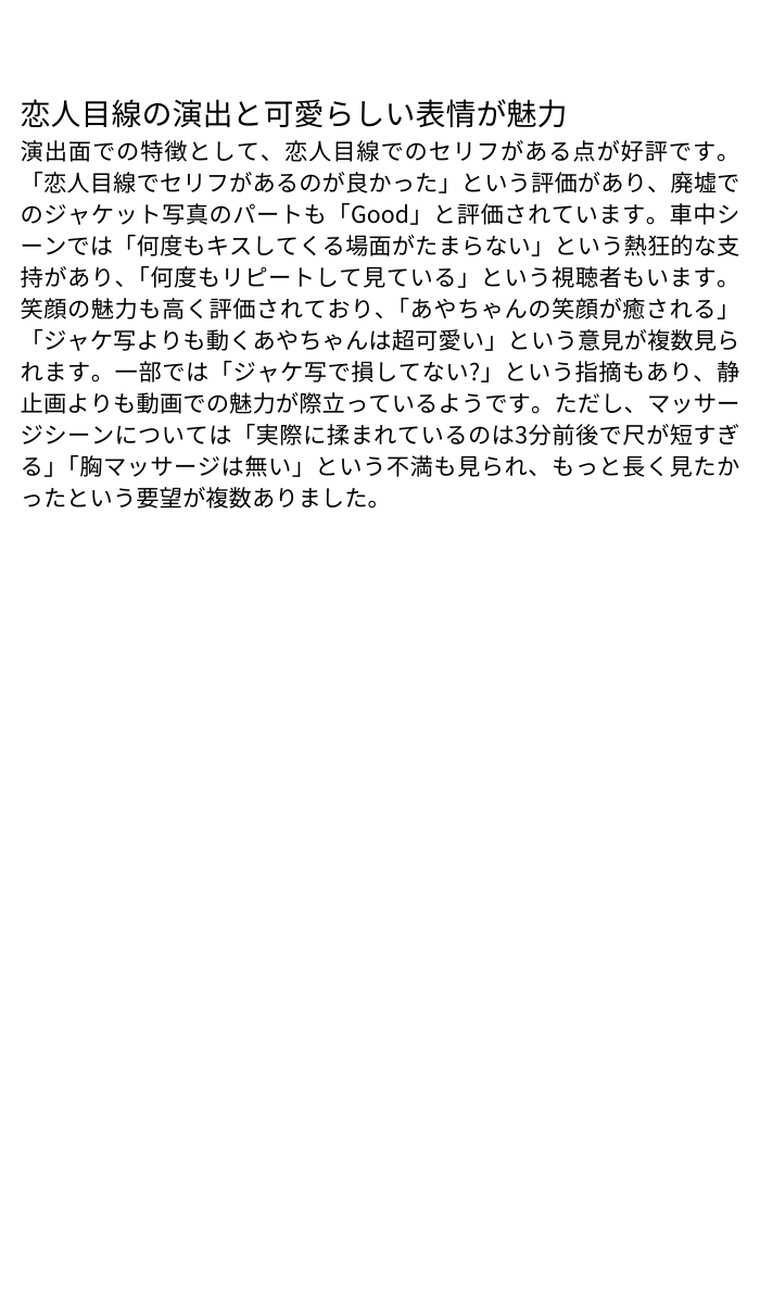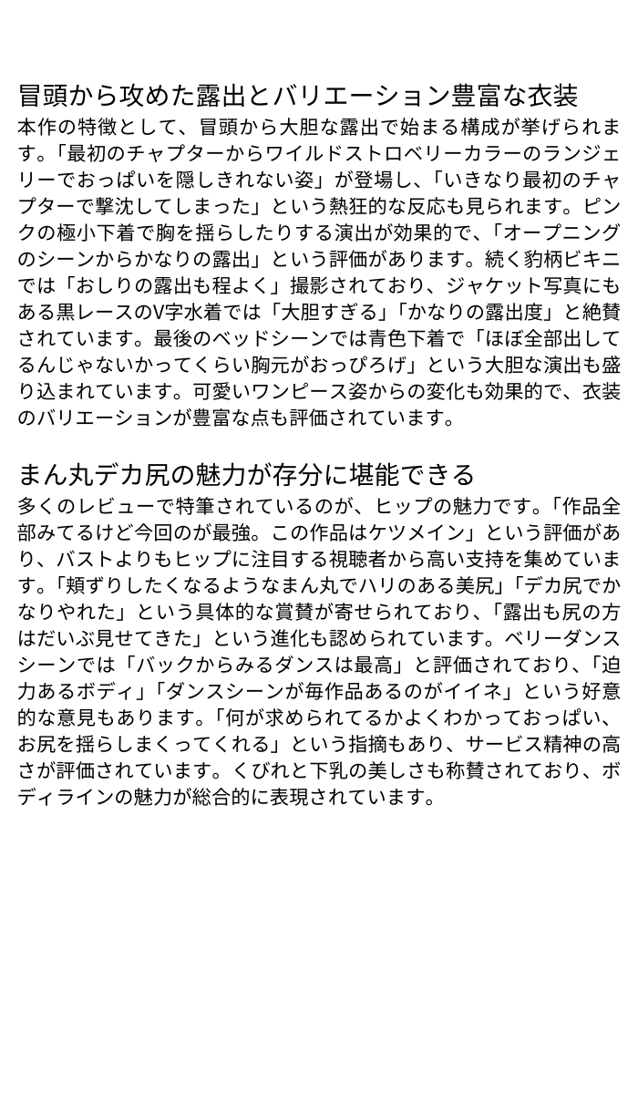 グアム旅行という設定と恋人目線の演出が好評で、シリーズ中でも最高傑作との呼び声が高い作品です。冒頭から大胆な露出で始まり、まん丸デカ尻の魅力を存分に堪能できる構成となっています。笑顔の可愛らしさと迫力あるボディのバランスが良く、全編通して見どころが豊富です。マッサージシーンの尺が短いという不満やヒップの接写がもっと欲しいという要望はありますが、全体としては高い満足度を提供できている傑作と言えるでしょう。