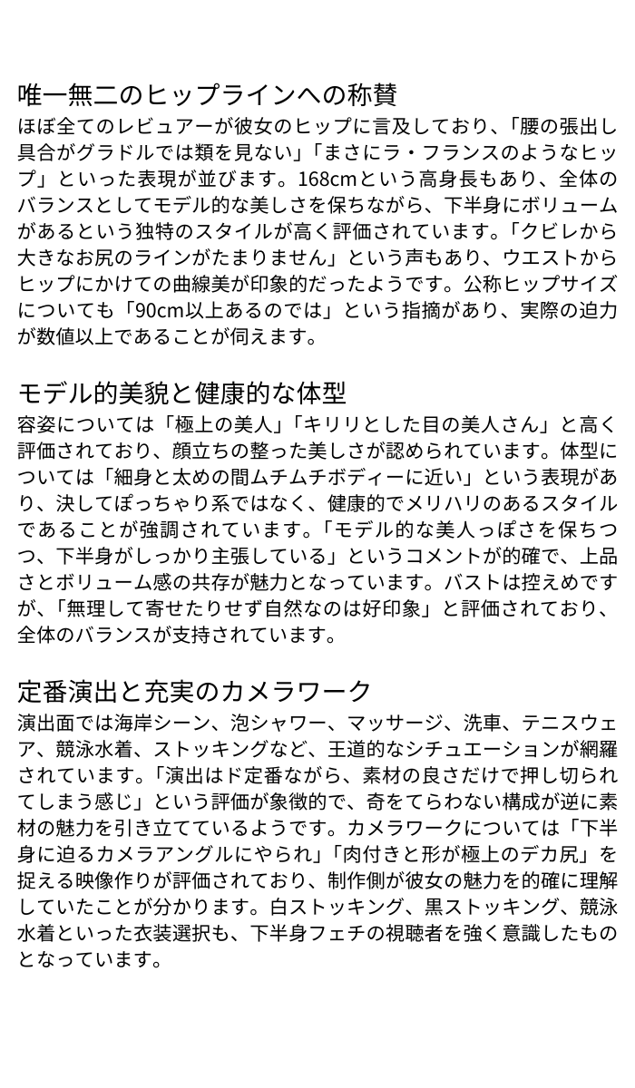 本作は、佐々木麻衣さんの持つ唯一無二のスタイル、特に「ラ・フランス」の名にふさわしいヒップラインを最大限に活かした作品となりました。美しい顔立ちとモデル的な雰囲気を保ちながら、豊かな下半身を持つという独特の魅力が、多くのフェチ層の心を掴んでいます。演出は王道的ですが、それが逆に素材の良さを引き立てる結果となっており、シリーズ中でも特に評価の高い一作として位置づけられています。下半身フェチにとっては見逃せない逸材と言えるでしょう。