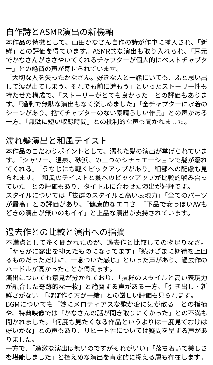 2022年12月に発売された山田かなさんのイメージビデオ「令和浪漫」は、本編77分と特典映像10分で構成された作品です。かなさん自作の詩をナレーションで挿入するという新しい試みや、ASMR的な演出が特徴となっています。全チャプターに水着シーンがあり捨てチャプターがないとの評価がある一方、過去作と比較して露出が控えめになったことや、演出のマンネリ化を指摘する声もあり、ファンの間で評価が分かれる結果となりました。
