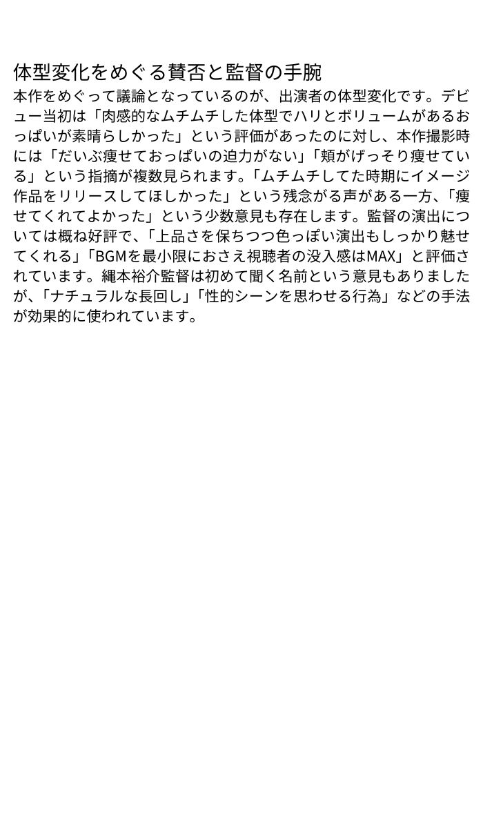 2025年3月に発売された本作は、デビュー作でありながら大胆な演出が話題を呼んだイメージビデオです。黒髪ロングの清楚なビジュアルと、想像以上に攻めた内容のギャップが多くの視聴者を驚かせました。縄本裕介監督によるBGMを抑えた演出が没入感を高めており、「2025年のマスターピース」という評価も見られます。体型変化についての賛否や今後の活動についての議論もありますが、デビュー作としては高い完成度を誇る作品となっています。