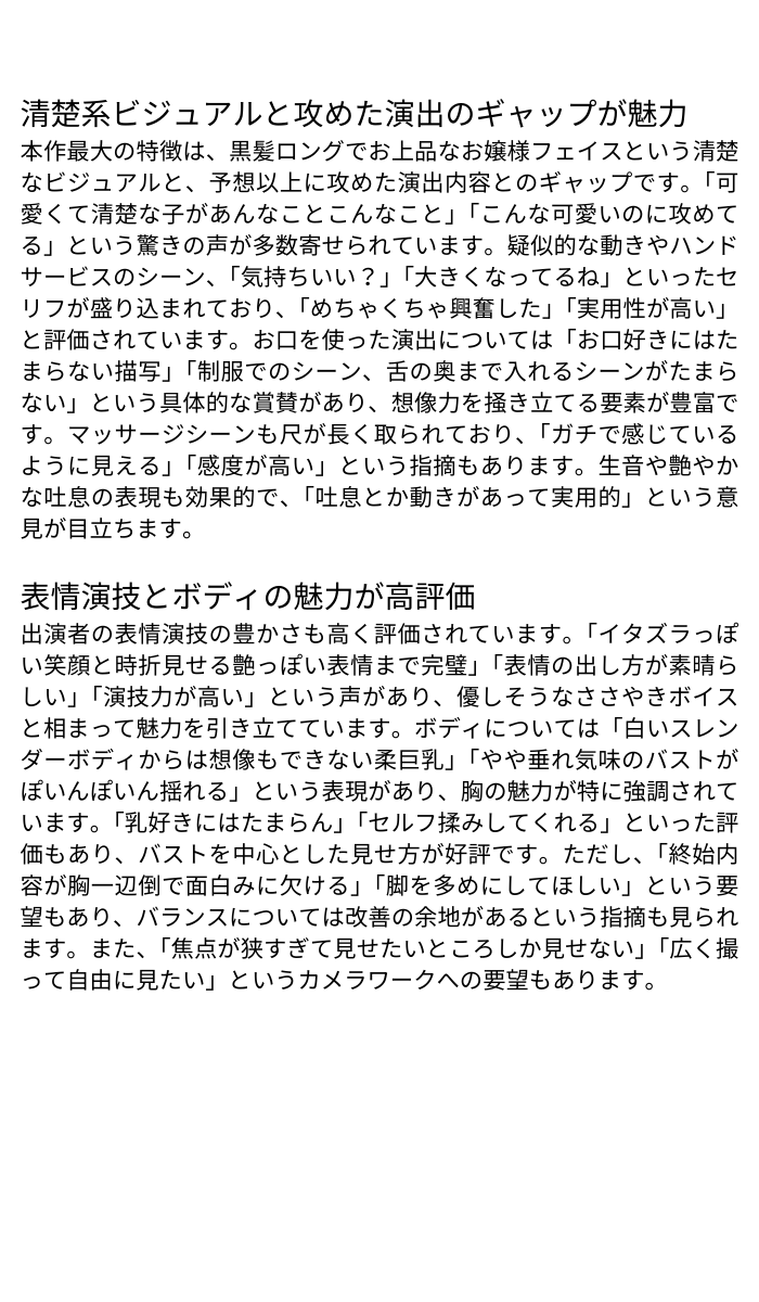 デビュー作としては攻めた内容で、清楚なビジュアルとのギャップが大きな魅力となっている作品です。表情演技の豊かさや実用性の高さが評価される一方、体型変化や撮影箇所の偏りについては賛否があります。イメージビデオ不況と言われる中で、これだけ攻めた内容の作品を出してくれたことへの感謝の声も多く、次回作への期待も高まっています。
